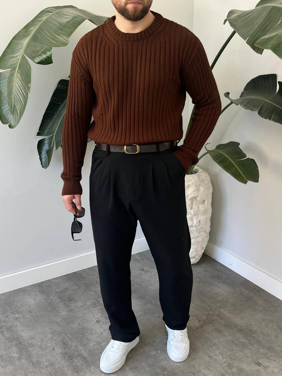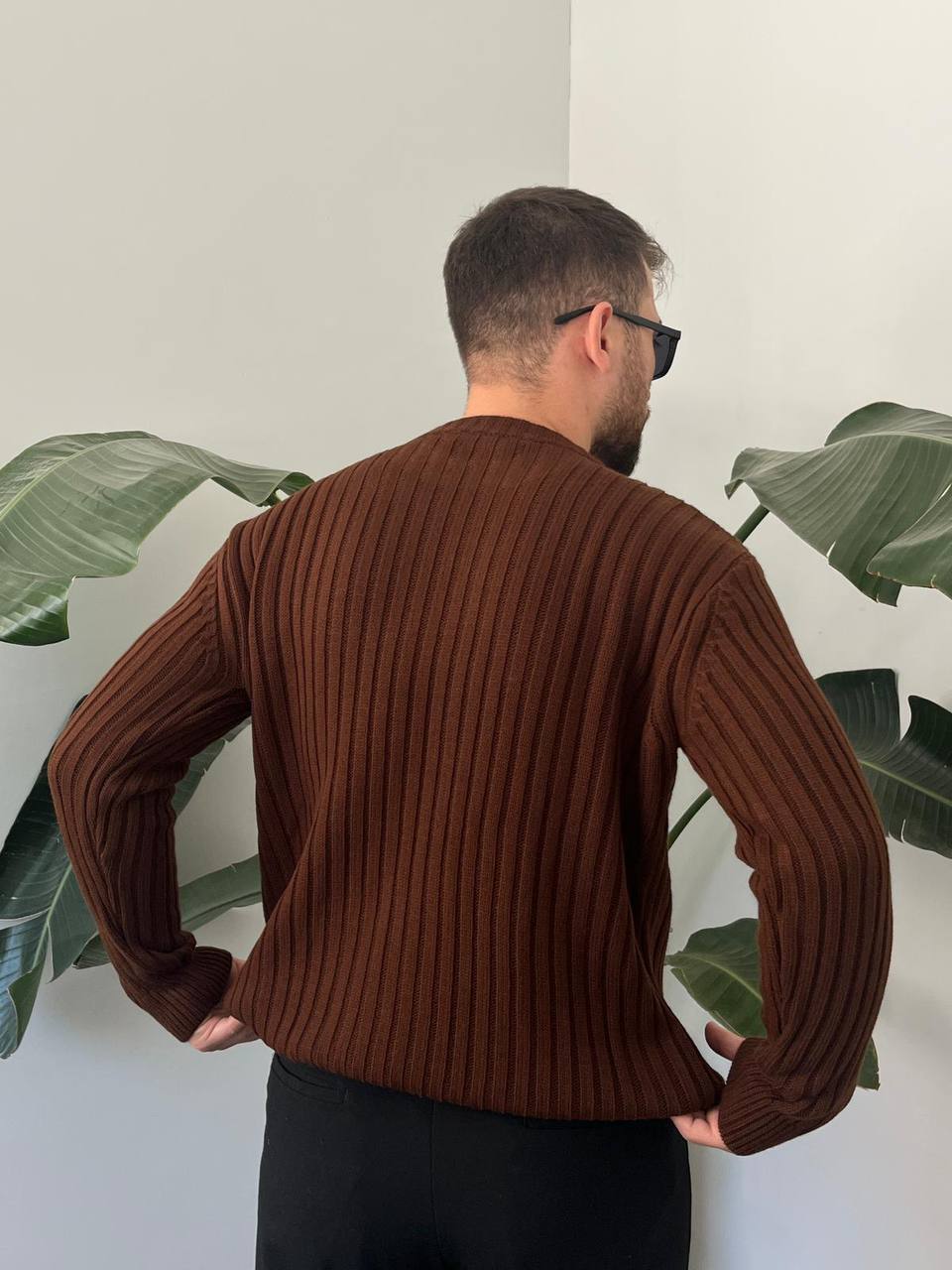 - Rahat ve şık bir görünüm için oversize kesim tasarımıyla dikkat çeken erkek triko kazak.