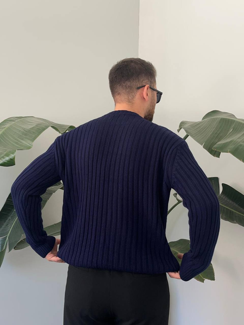 - Rahat ve şık bir görünüm için oversize kesim tasarımıyla dikkat çeken erkek triko kazak.