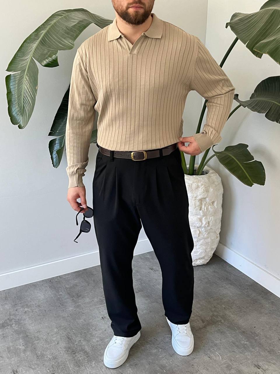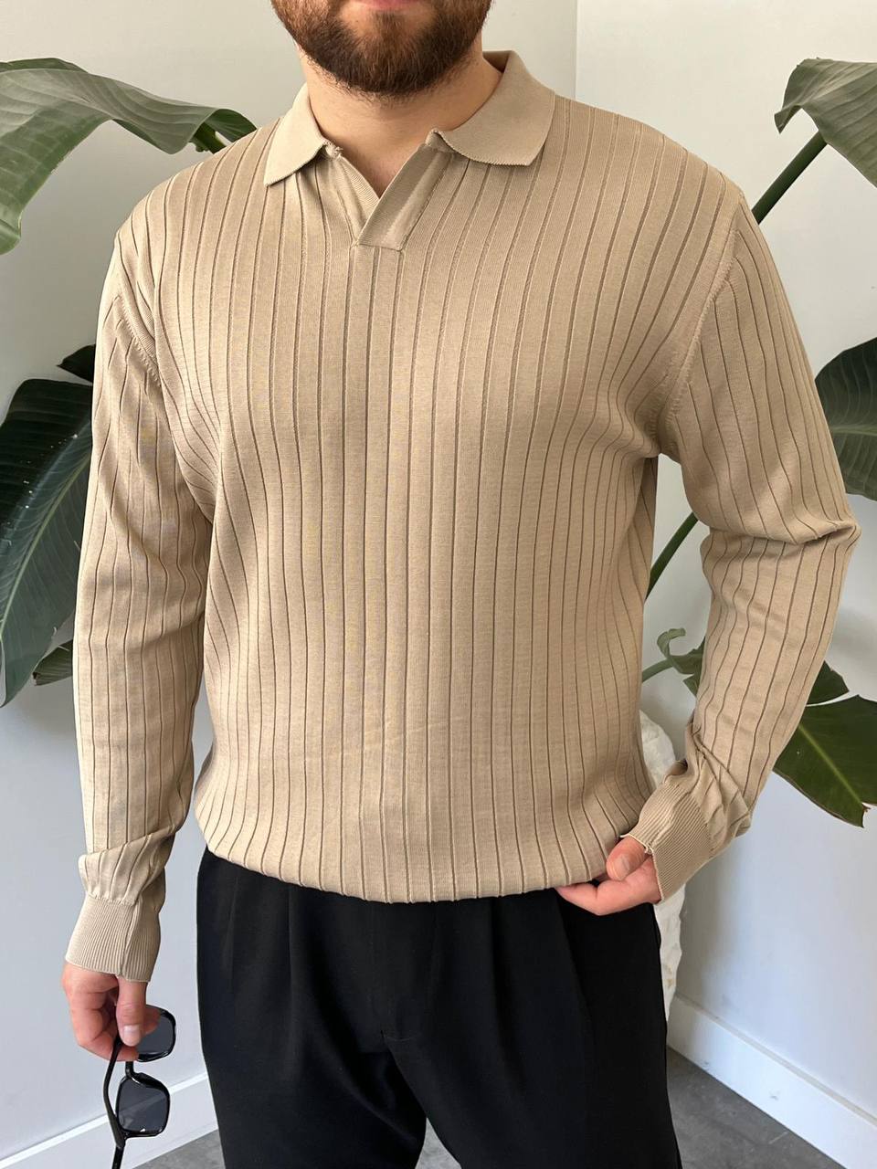 - Günlük kullanım için ideal, rahat ve şık bir görünüm sunan Polo V pat yaka Kendinden Çizgili Triko Kazak.