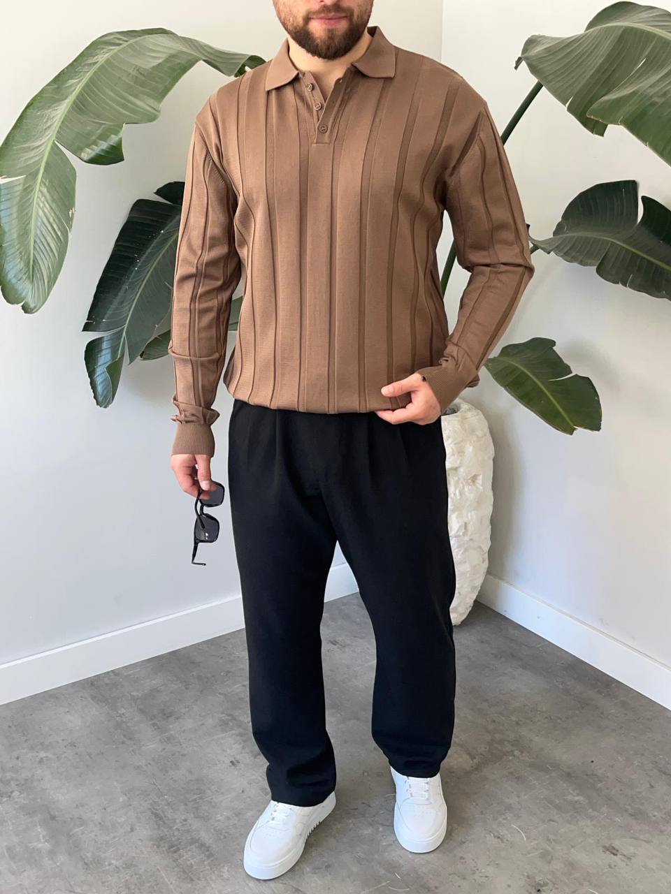 - Günlük kullanım için ideal, rahat ve şık bir görünüm sunan Polo düğmeli yaka Kendinden Çizgili Triko Kazak.