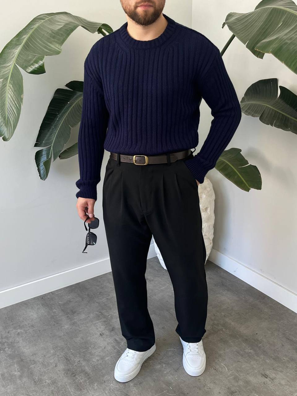 - Rahat ve şık bir görünüm için oversize kesim tasarımıyla dikkat çeken erkek triko kazak.