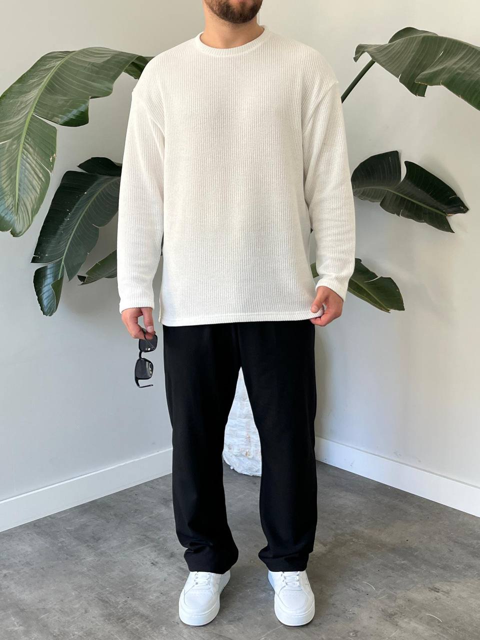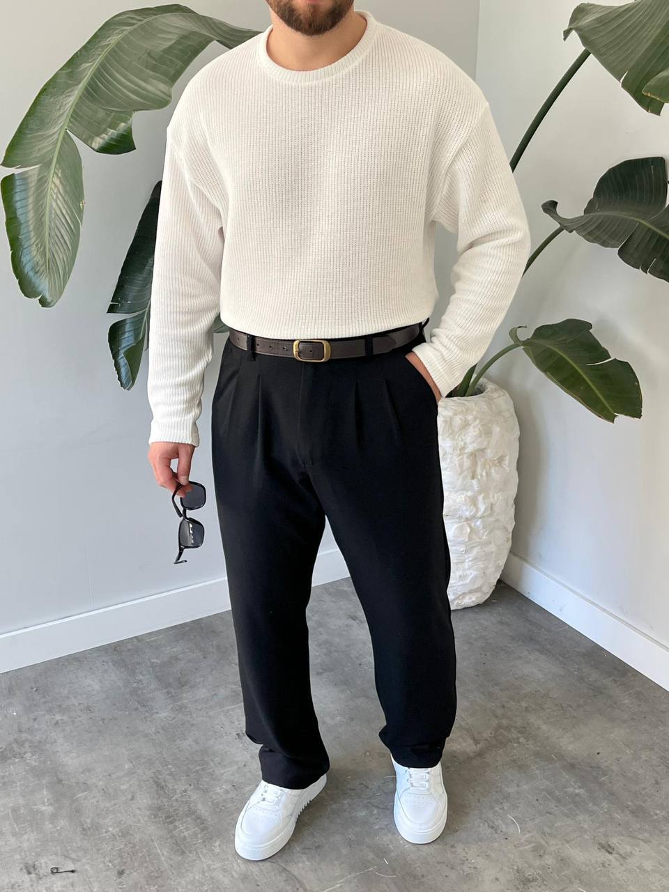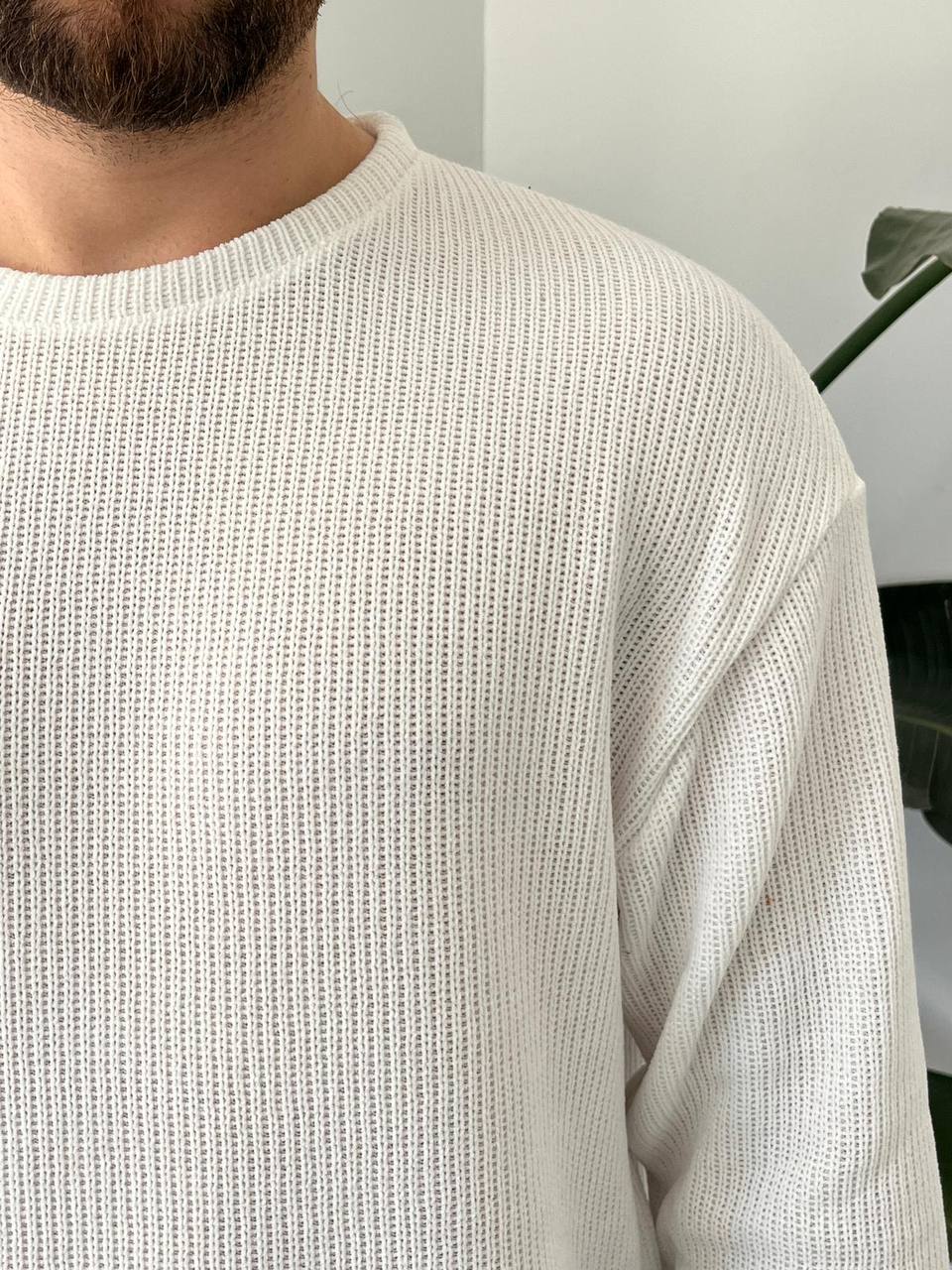 - Rahat ve şık bir görünüm için oversize kesim tasarımıyla dikkat çeken erkek triko kazak.