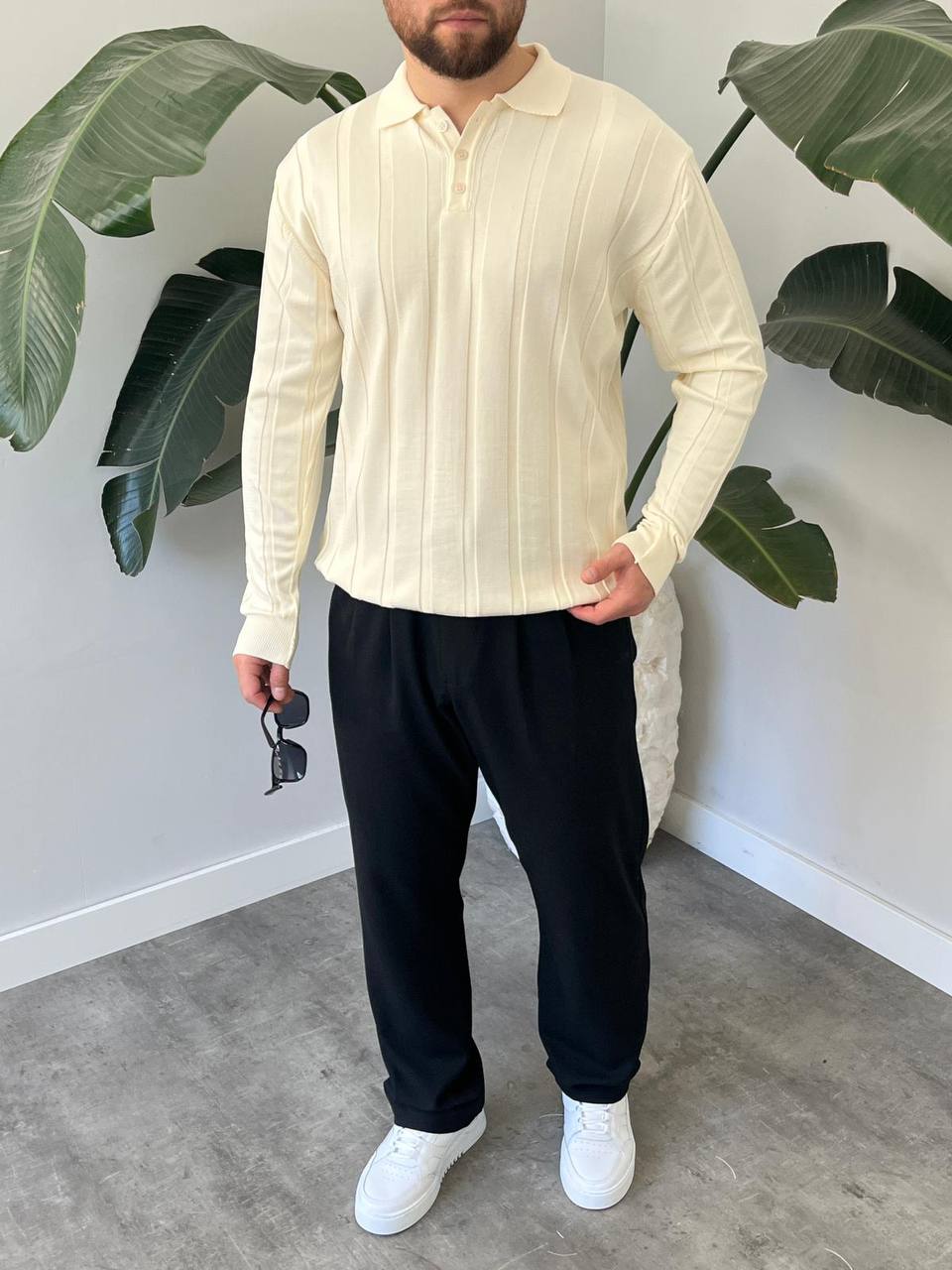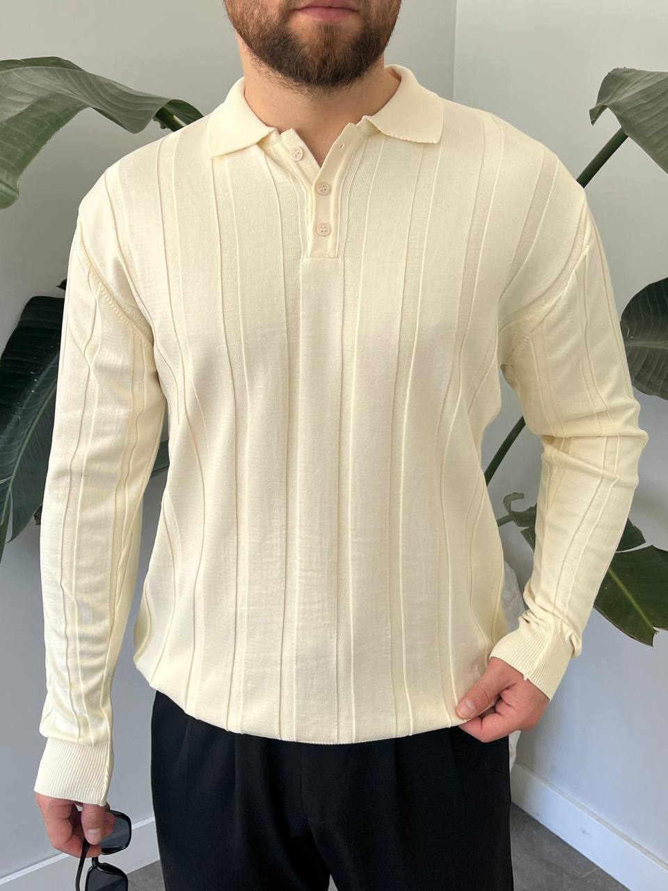 - Günlük kullanım için ideal, rahat ve şık bir görünüm sunan Polo düğmeli yaka Kendinden Çizgili Triko Kazak.